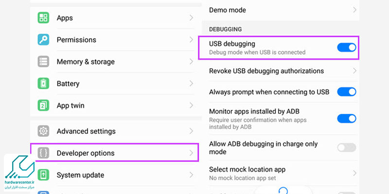 ۴. فعال بودن USB Debugging در Developer Options